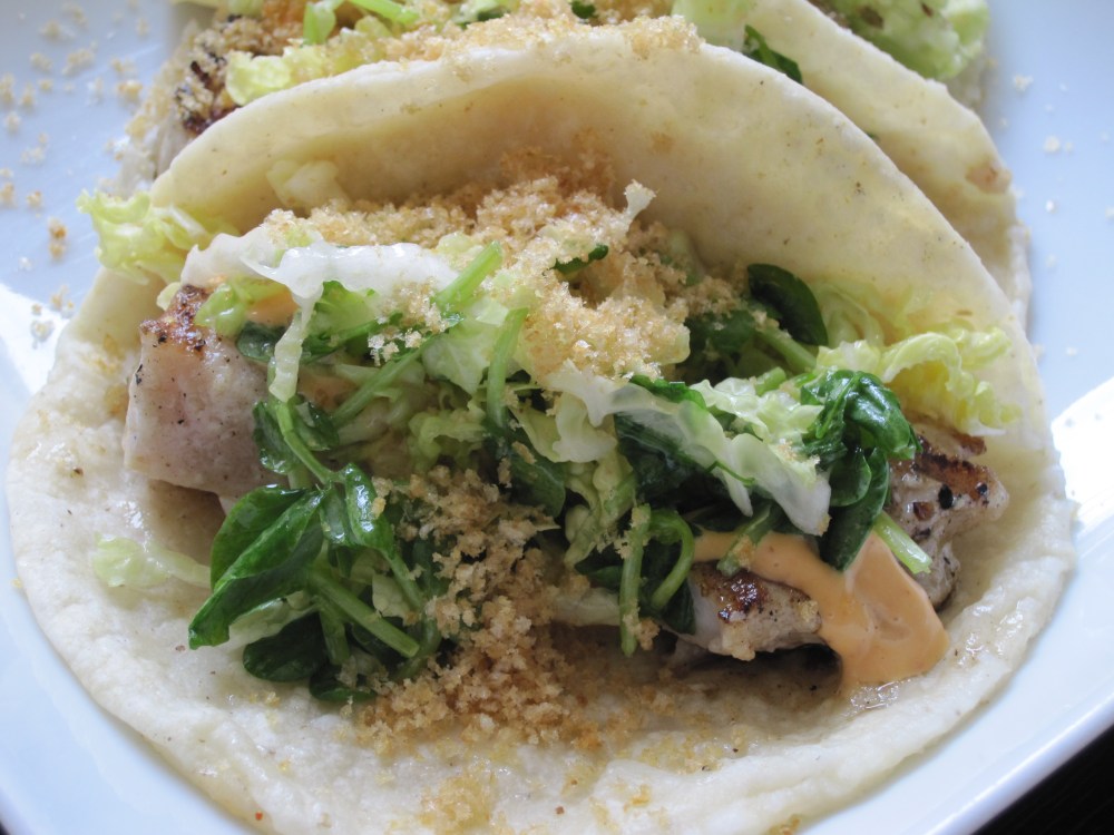 Fish Taco: Rockfish, chipotle aioli, chicharron, garlic, pea shoots. Perfect size and great flavor combination. Pea shoots added a nice dimension and balanced the aioli.