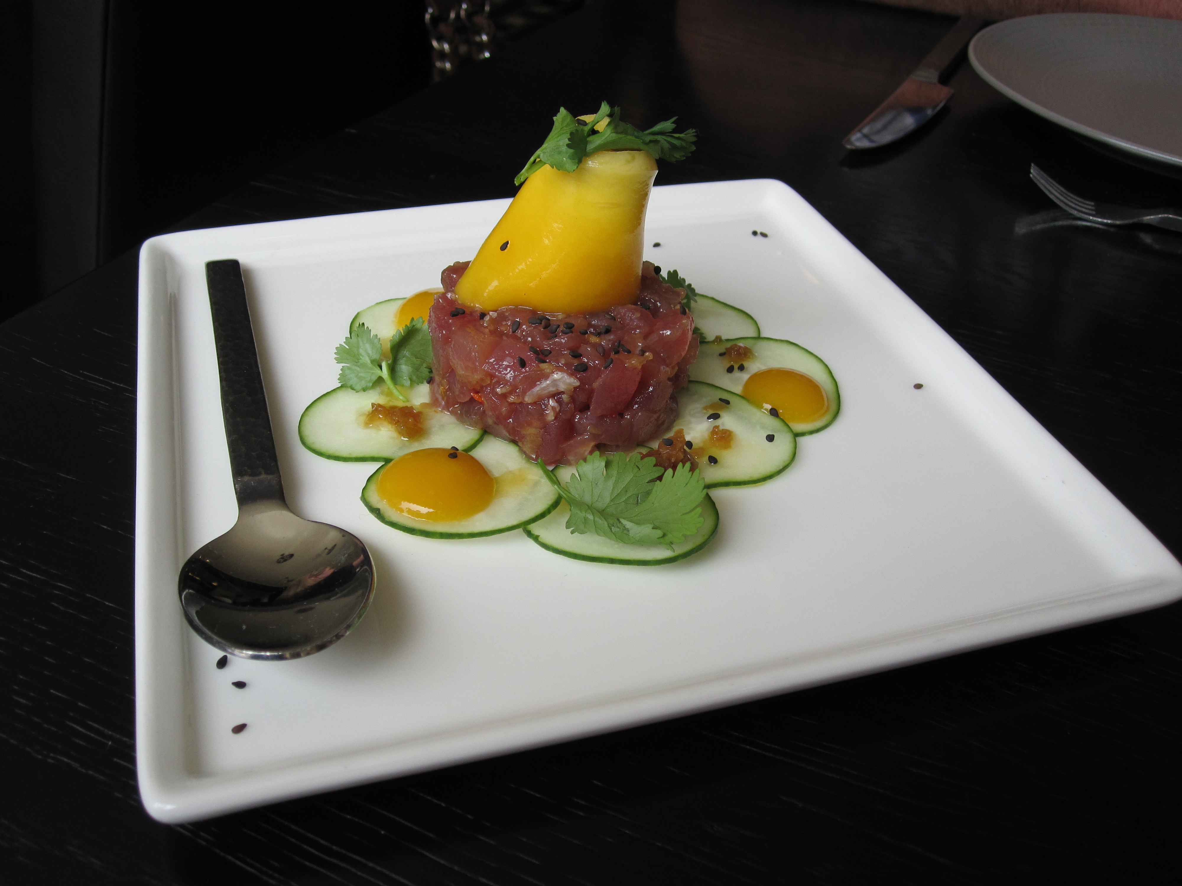 Tuna Poke: mango, cucumber, black sesame. Fresh and good flavors. The mango keeps this dish from tasting like the standard poke.