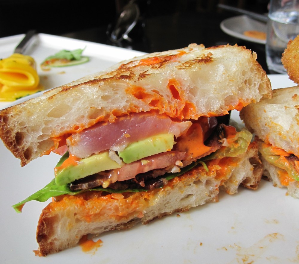 Tuna BLT: seared tuna, bacon, lettuce, tomato, avocado, aioli. Served with Fried Pickles. This was my favorite dish of the meal. The tuna was seared perfectly, sourdough bread was fresh, avocado/bacon/aoili and tomato together, delicious.