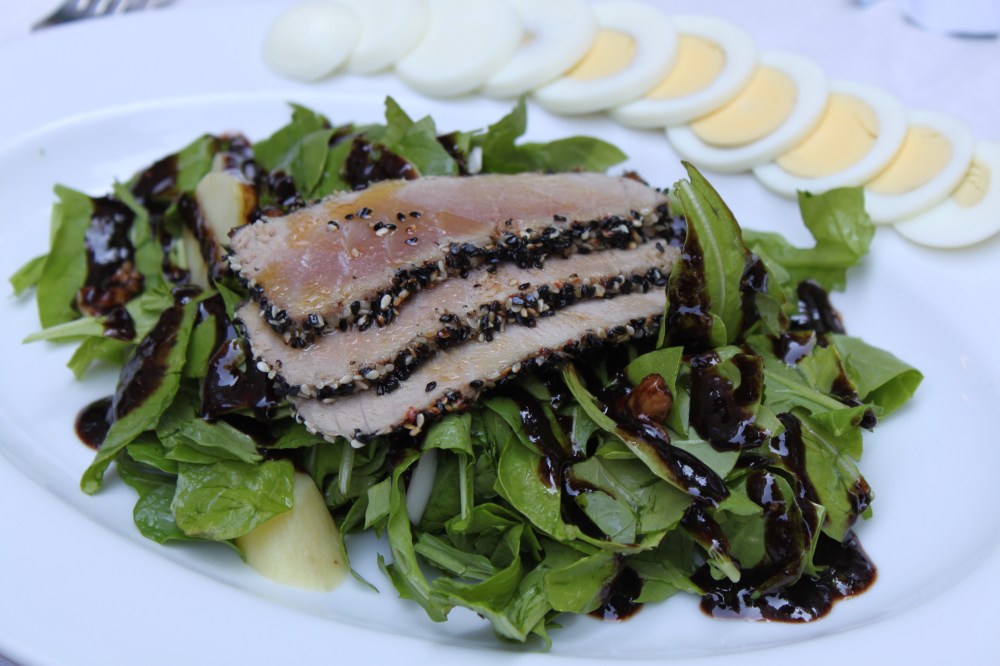 Sesame Crusted Tuna: Arugula, lettuce, finger link potatoes, walnuts, hard-boiled egg, red onion, raspberry balsamic reduction. The portions were good and overall good flavor but if you are picky about your tuna this might not be the most memorable. I’m talking people who are used to high-grade quality tuna cooked rare.