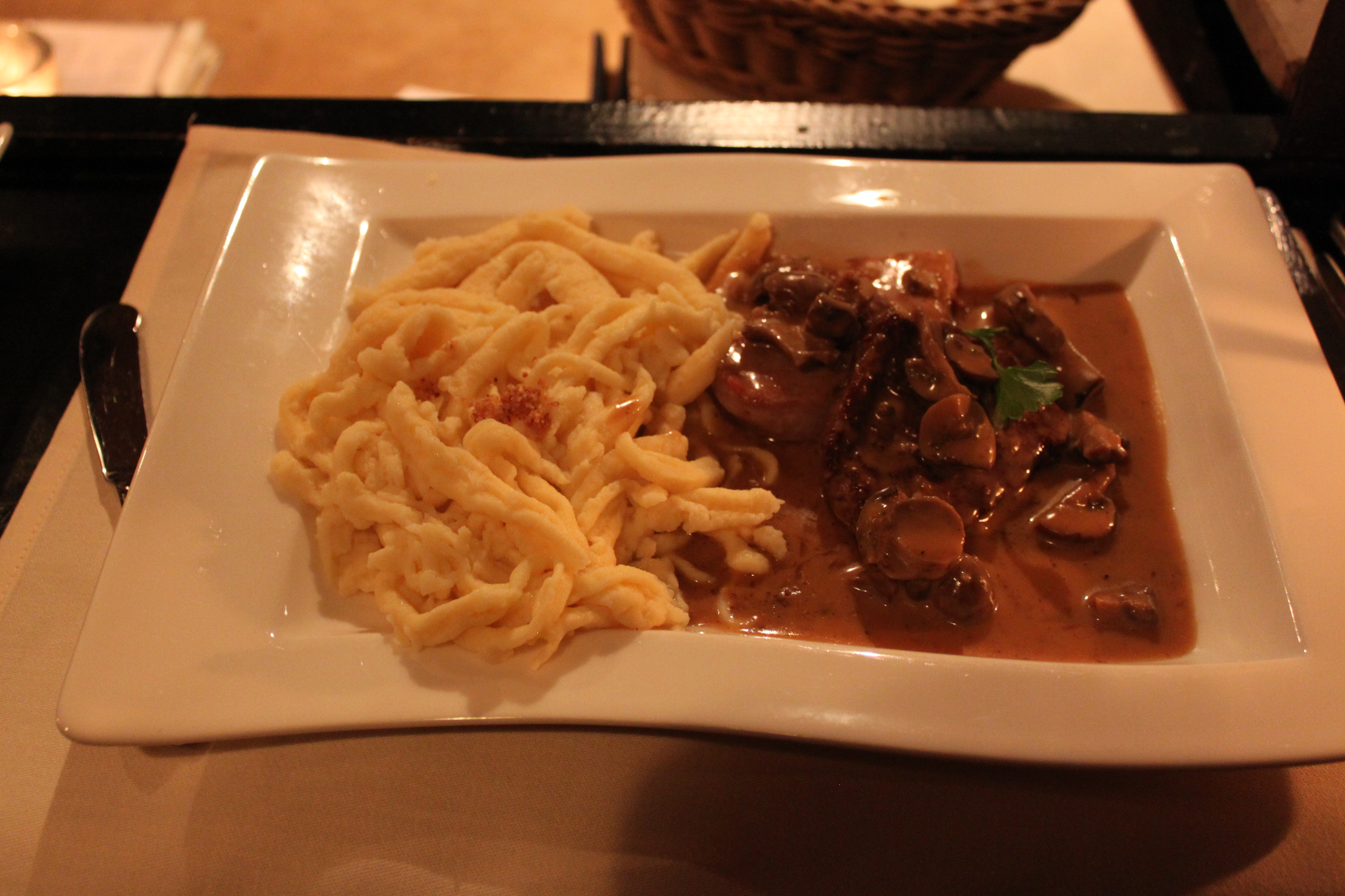 The Hauptspeisen (main course) was the Ackerbürgerpfannle – Rinder un Schweinemedaillon vom Grill mit Steinchampignons in Cognacsahne, dazu handegeschabte Spatzle. Wait, what? That was my reaction anyway…basically beef medallions and pork grilled with porcini mushrooms in a cognac cream, served with Spätzle. To say it was good is an understatement. The cognac sauce was rich and the meat was literally mouth-watering. You must get this dish.