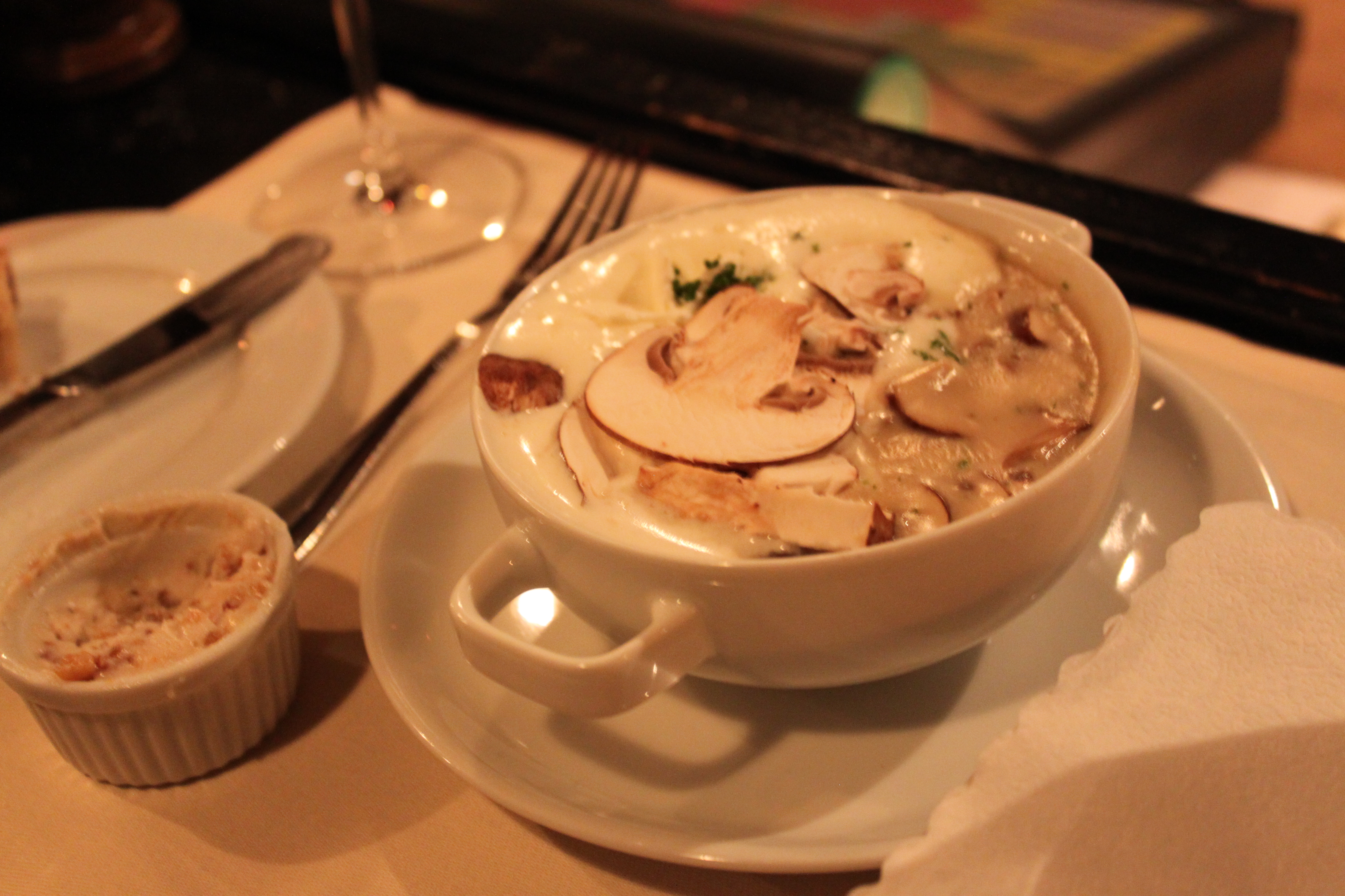 After taking in what a find this place was it was on to the food. Appetizers of Carpaccio vom Rinderfilet an Ackersalat in Kürbiskernvinaigrette (Beef Carpaccio) and Cremesuppe von champignons (Cream of Mushroom soup). Hands down the best mushroom soup I have ever had. The mushrooms were so fresh I think they actually were picked a few minutes before they were cooked. The sauce was rich and creamy but not so overpowering that you felt you couldn’t move on to a main course. I do suggest splitting it. The Carpaccio was of very high quality and the pumpkin seed vinaigrette was a refreshing change.