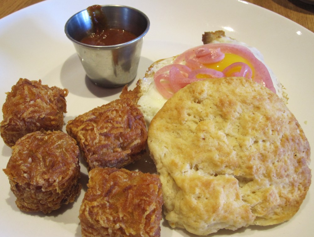 I had the Belly Sandwich – biscuit, pork belly, sunny side egg, pickled onions and tots. The best part of the sandwich was the biscuit. Rich, flakey and fresh. The best part of the meal was the tots. When I saw there were only four tots I thought that was a bit odd and would not be enough. However, these tots are bigger than any tots I have had and a lot richer. Four was PLENTY. They are extra crispy on the outside and nice and soft on the inside. Next time here I will be getting a side of tots no matter what I order (I am thinking it will be the Cuban: sourdough, pulled pork, pork belly, mustard, gruyere, house made pickles, sans the pork belly).