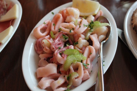 The Insalata di Mare has calamari, cuttlefish, shrimp, celery and kalamata olives with lemon and oil. I have had a variety of calamari and usually it fails. This calamari is very good, poached with a nice texture.