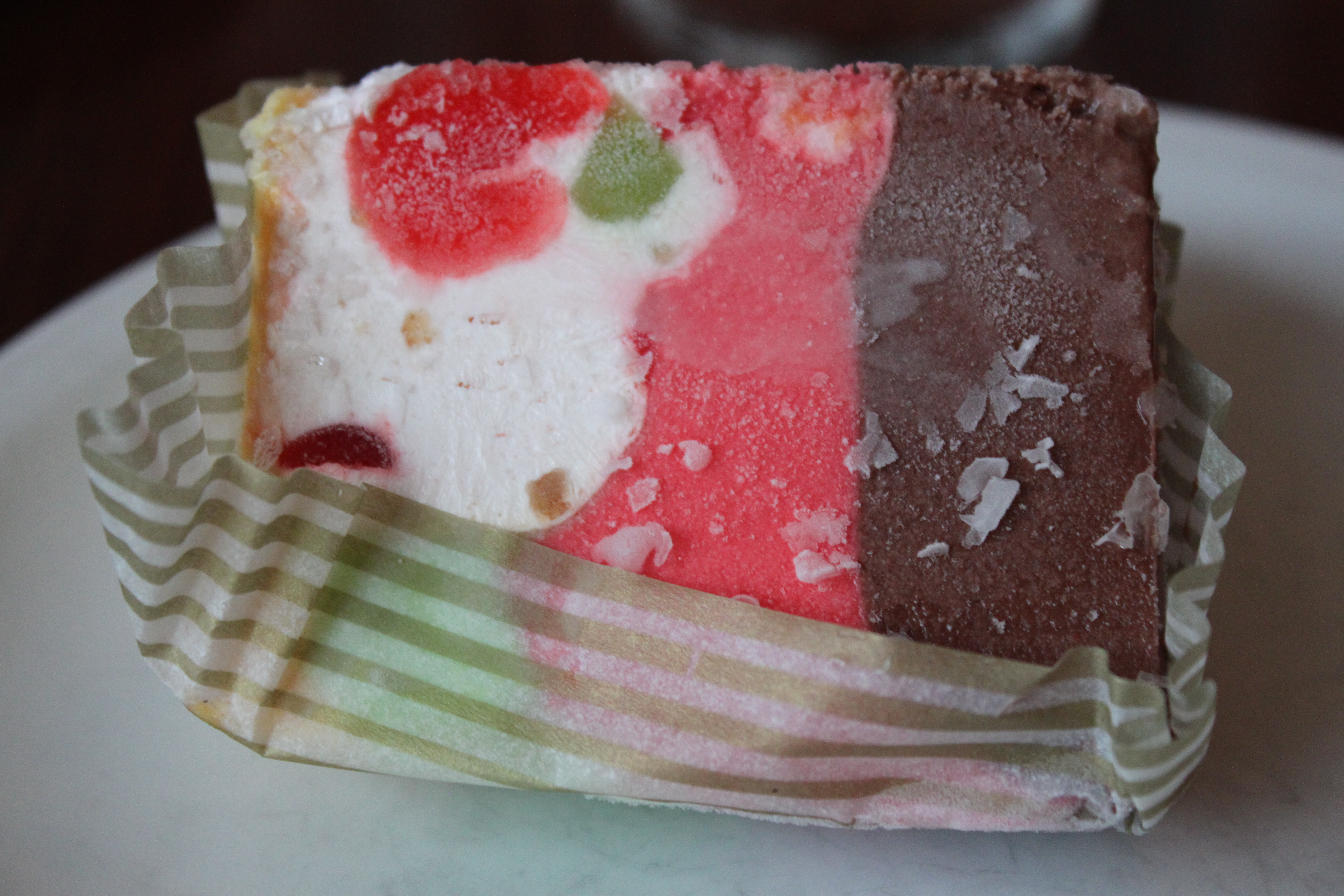 Last but not least Spumoni. I remember having this as a child and wanted to see if I remembered the taste. Not sure what took me so long to get this again but I am glad I did. How can you go wrong with pistachio, rum, strawberry and chocolate ice cream with whipped cream and candied fruit center? It tastes as good at it looks: