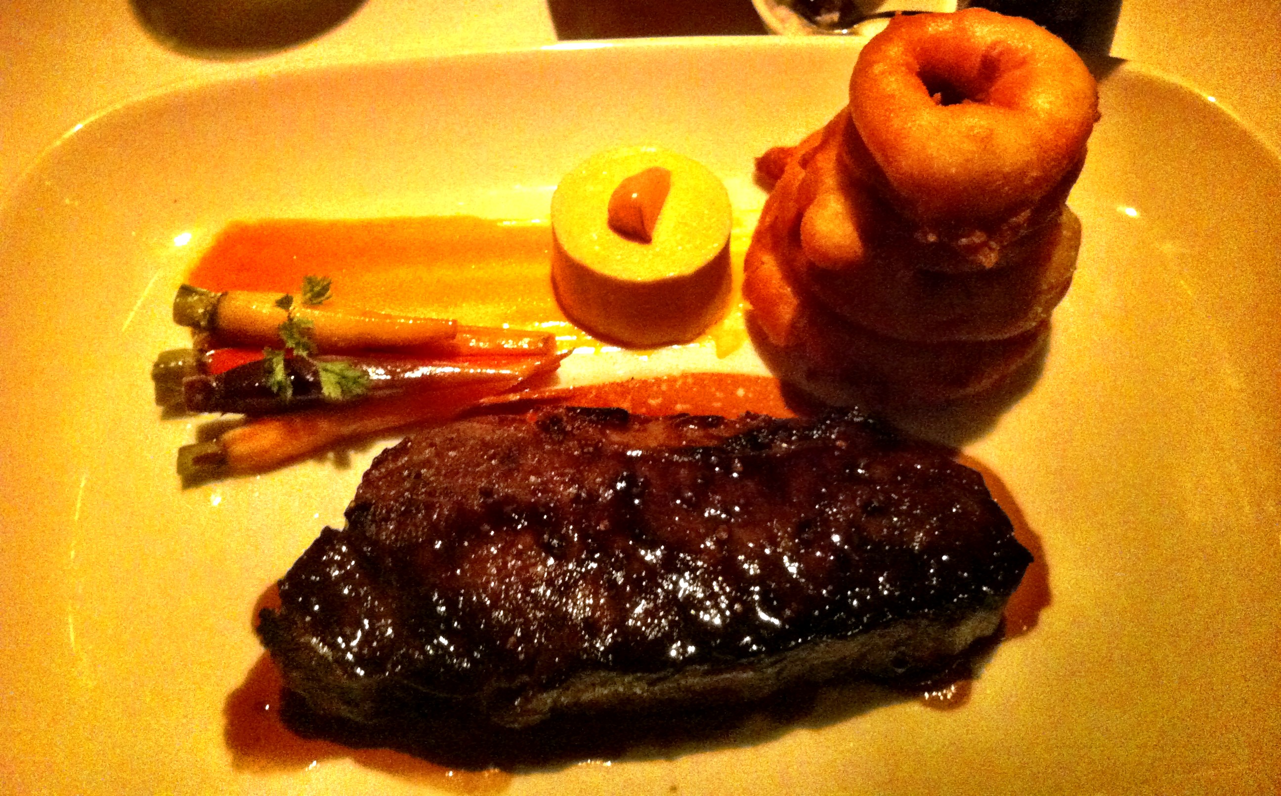 28-DAY DRY AGED NEW YORK STEAK – marrow mustard custard and Vidalia onion rings