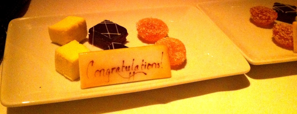 Time for dessert. Well we were both stuffed and decided to go “light” with some sorbet. The sorbet came and then so did two, yes t-w-o dishes of chocolates and candies with a “Congratulations” and “Happy Anniversary” note. It was so sweet of them to do this and made me smile.
