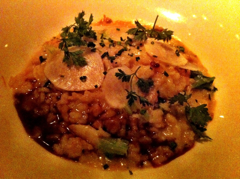 GOTHAM RISOTTO – chicken sausage, bacon, broccoli rabe and Tokyo turnips, Parmigiano Reggiano. This waitress recommended this dish and she knew what she was talking about. If you are used to being served larger portions after you take one bite you will understand why this dish is portioned as it is. This dish is so flavorful and rich you will be satisfied with just a few bites but wanting more so you will keep eating. The turnips and broccoli rabe lighten up the dish and add more flavor dimension (not that it needed it).