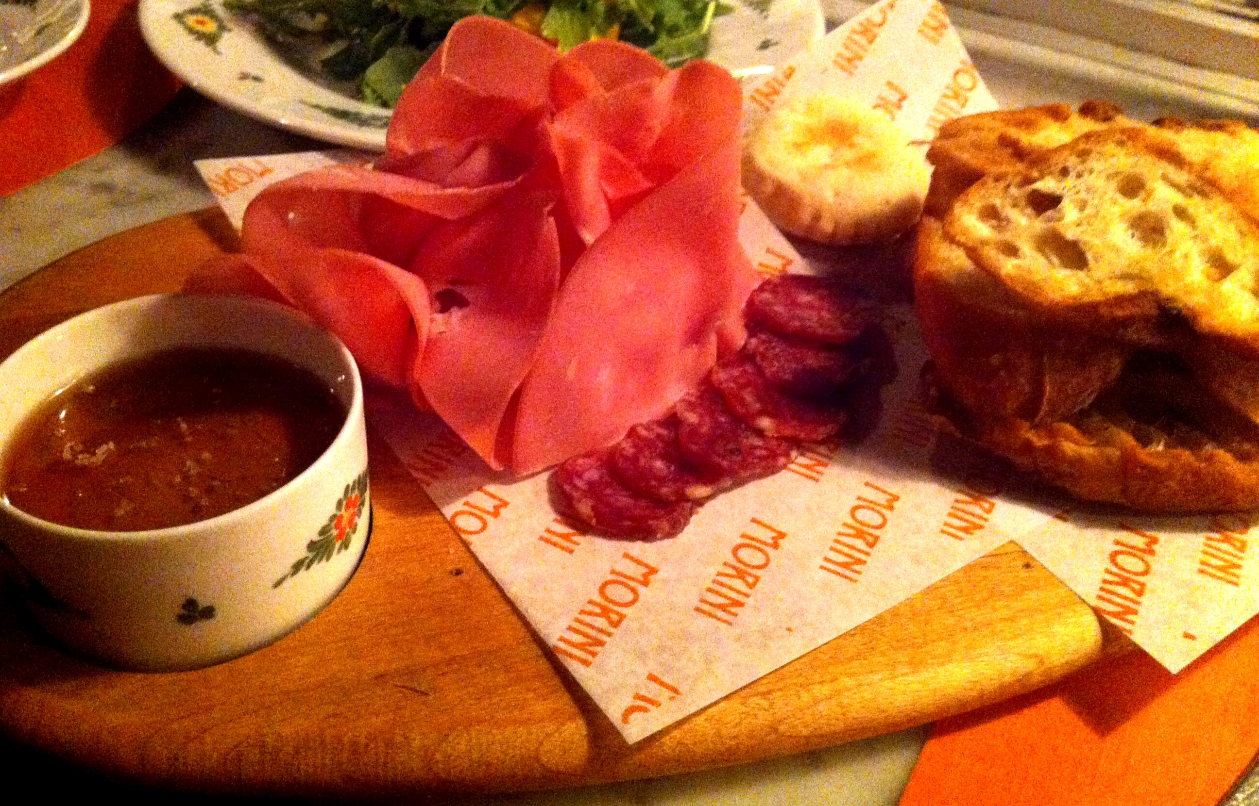 We started with the Rucola salad: wild arugula, peaches, speck and white balsamic. Peaches tasted so fresh and worked with the speck. Next order was the Battilardo di Affettati (cured sliced meats with grilled bread & Tigelle Modenese).