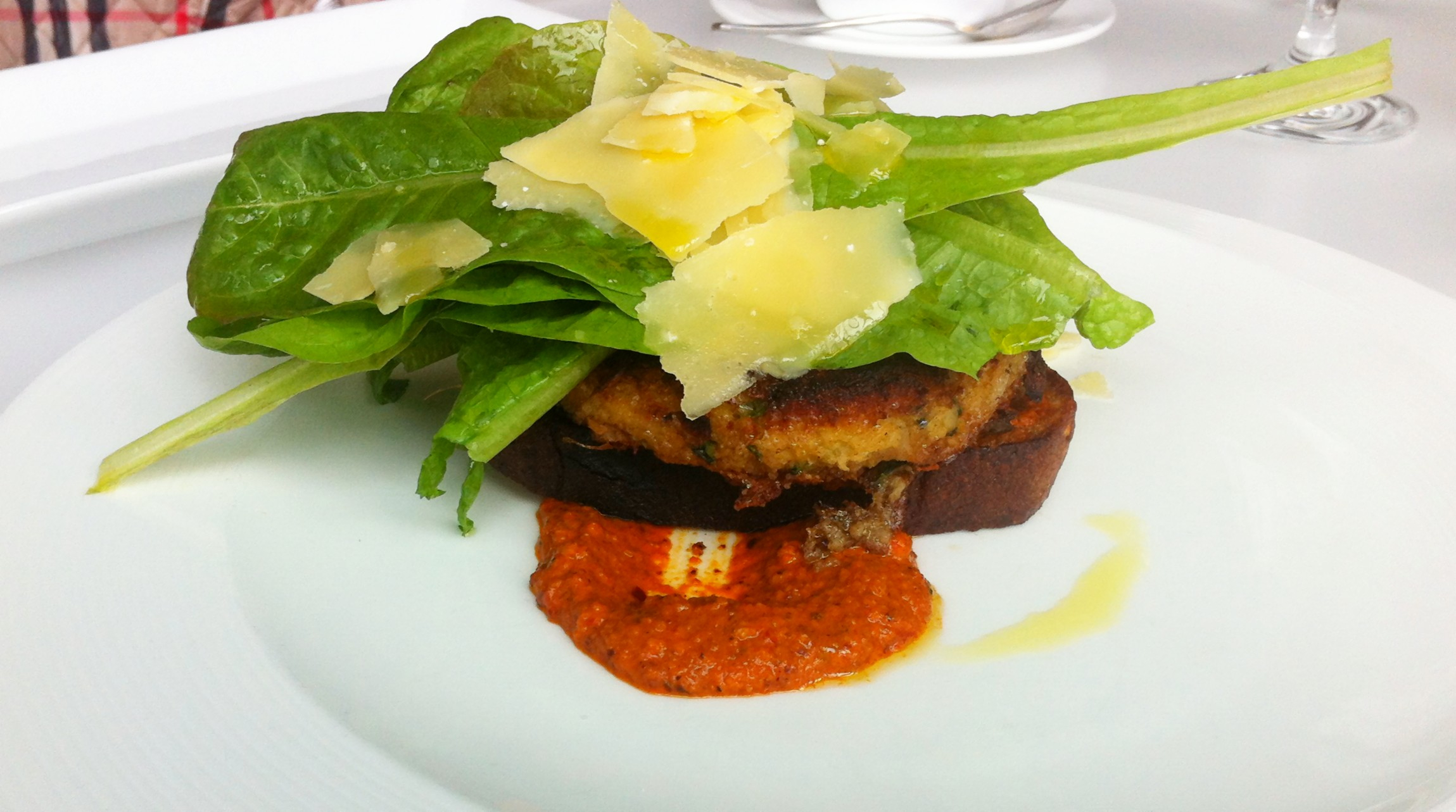 Everything on the menu sounded delicious. I had the chickpea and veggie burger with zucchini and chillies, served open-faced with romesco, tender greens, Parmesan and lemon. I am usually skeptical of veggie burgers since most of the time they taste bland to me. Maybe it was the addition of the chickpeas but this “burger” (it’s more of a sandwich) was full of flavor and tasted complex (for real). I was glad it was served open-faced on seven-grain bread, as a bun would have gotten in the way. The burger had a soft consistency with a crusted outside and was more than filling. The romesco sauce had a little kick to it, which was nice.