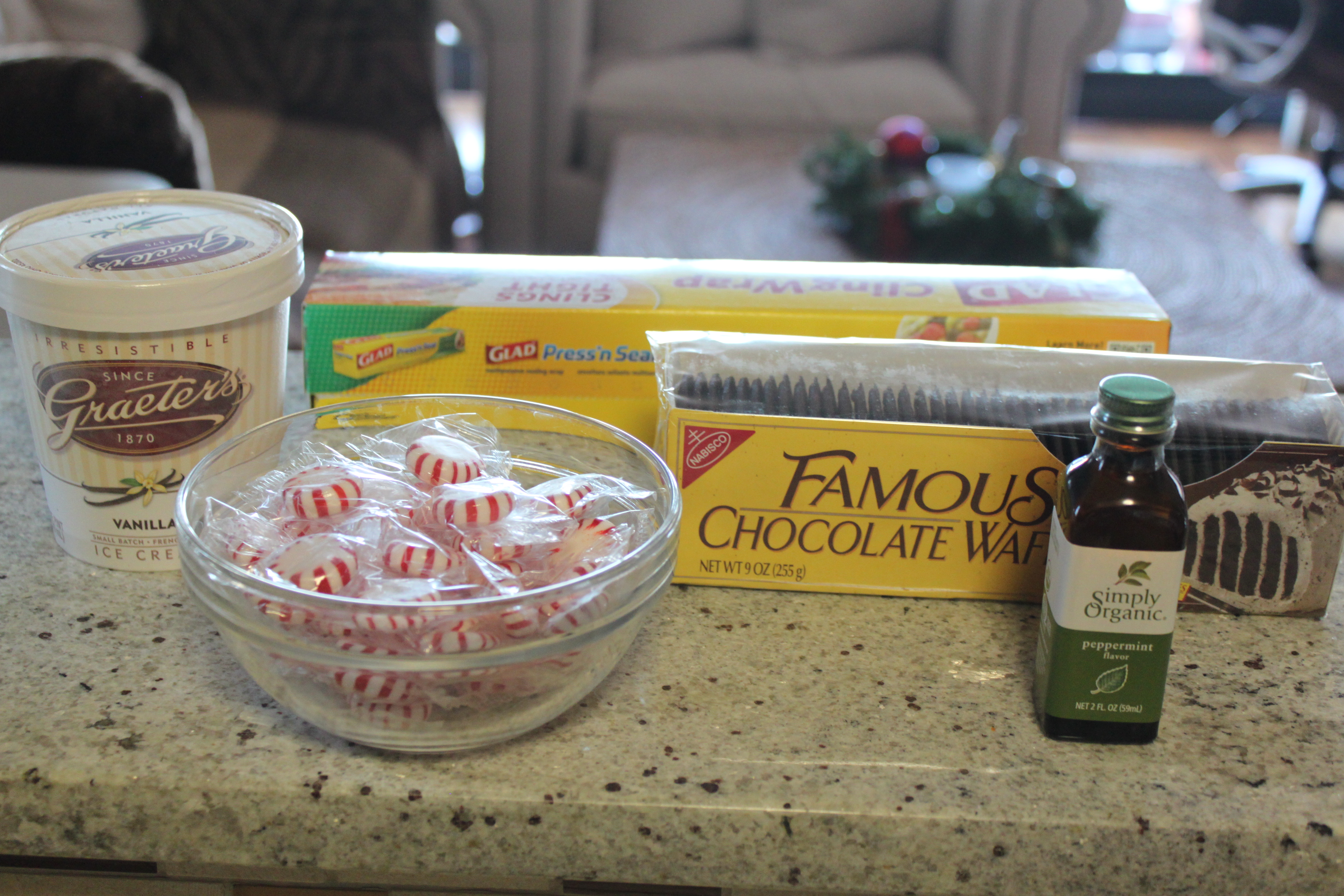 1 pint premium vanilla ice cream, 1/4 teaspoon peppermint extract, 1 cup finely crushed peppermint hard candies, and chocolate wafers.