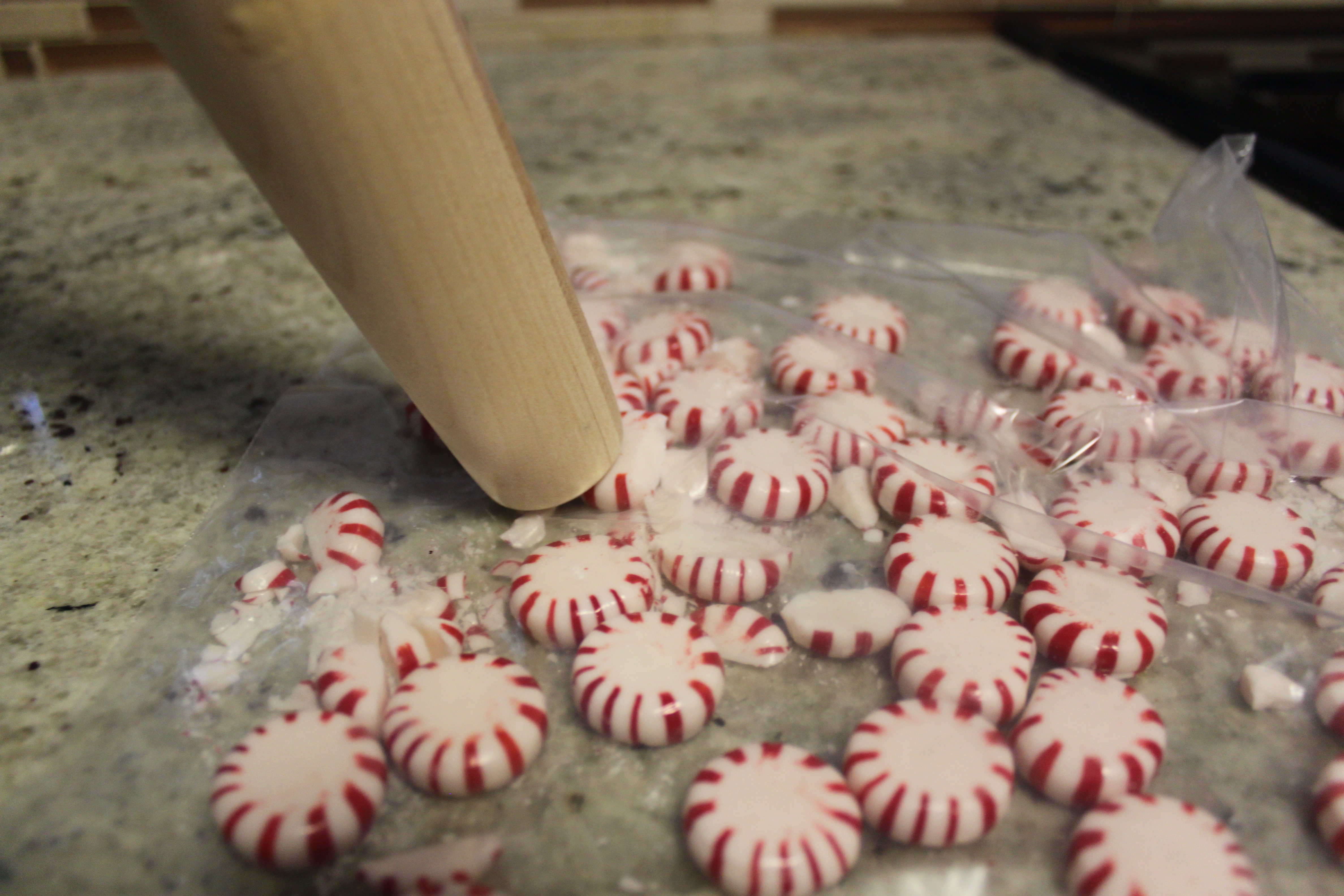 Initially I tried to crush the candies by putting them in a ziplock bag and using the end of a rolling-pin. This will work but it will take a lot of time.