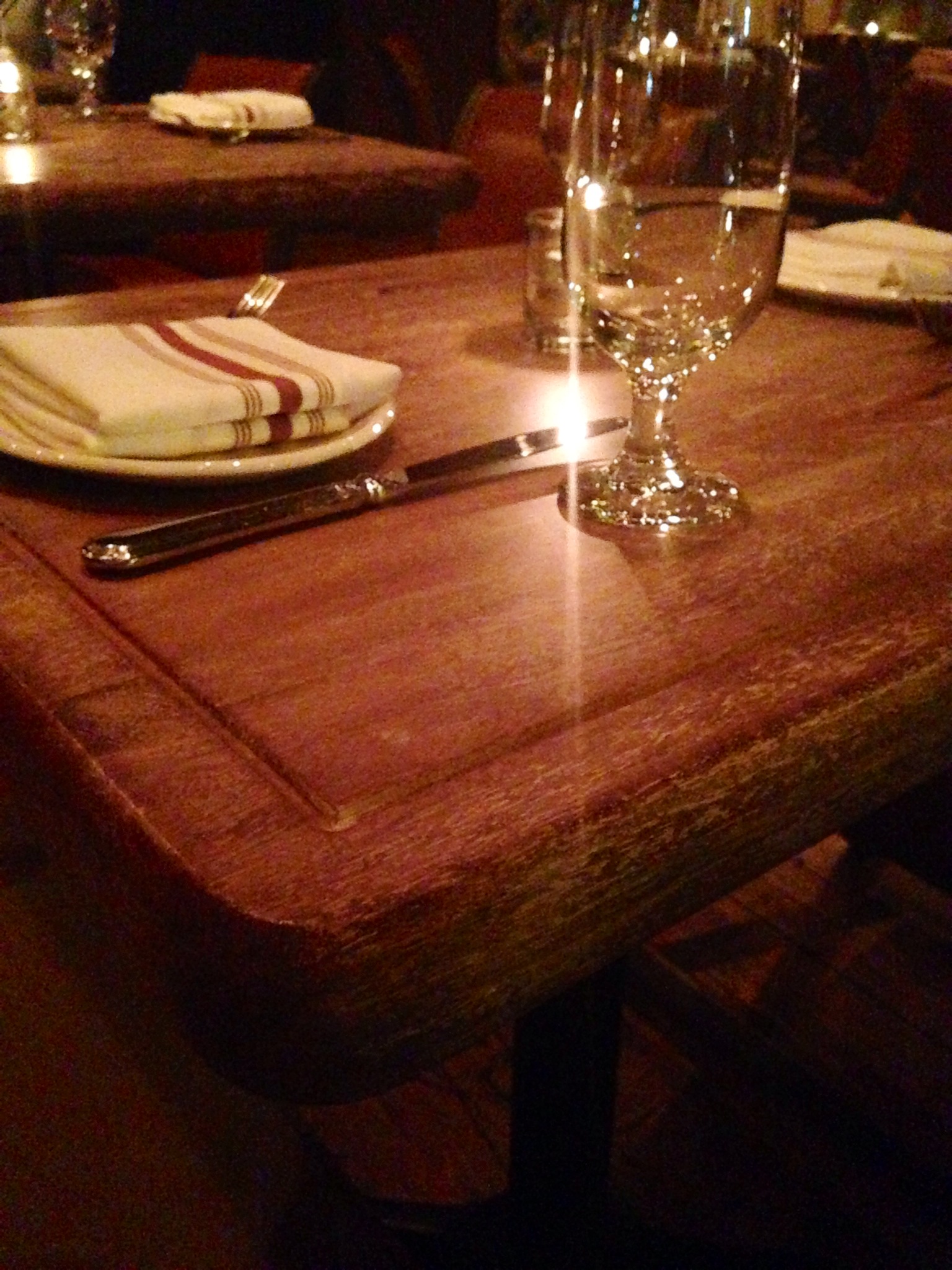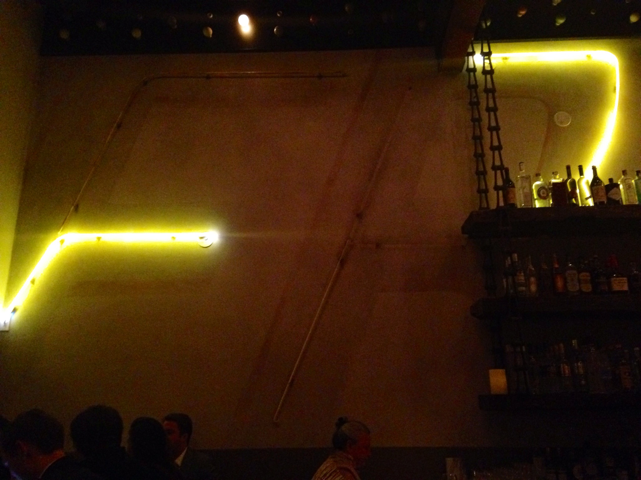 My favorite design element was the fragments of neon lights covering the north wall of the main dining room. Bright yellow neon over faint writing against the cream-colored wall. Wondering what the story was behind it I asked the hostess and she let me know it spelled out “Fra Mani” meaning between the hands (more or less). This was reference to the homemade pasta and to give a retro Italian movie theater feel to the restaurant.
