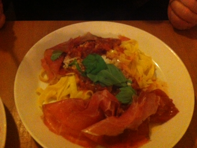 Tagliatelle Lorenzo: Tagliatelle with a sauce of fresh tomatoes, garlic, onions, bay leaves and basil, topped with prosciutto and Parmesan. If prosciutto is your thing then this is your dish.
