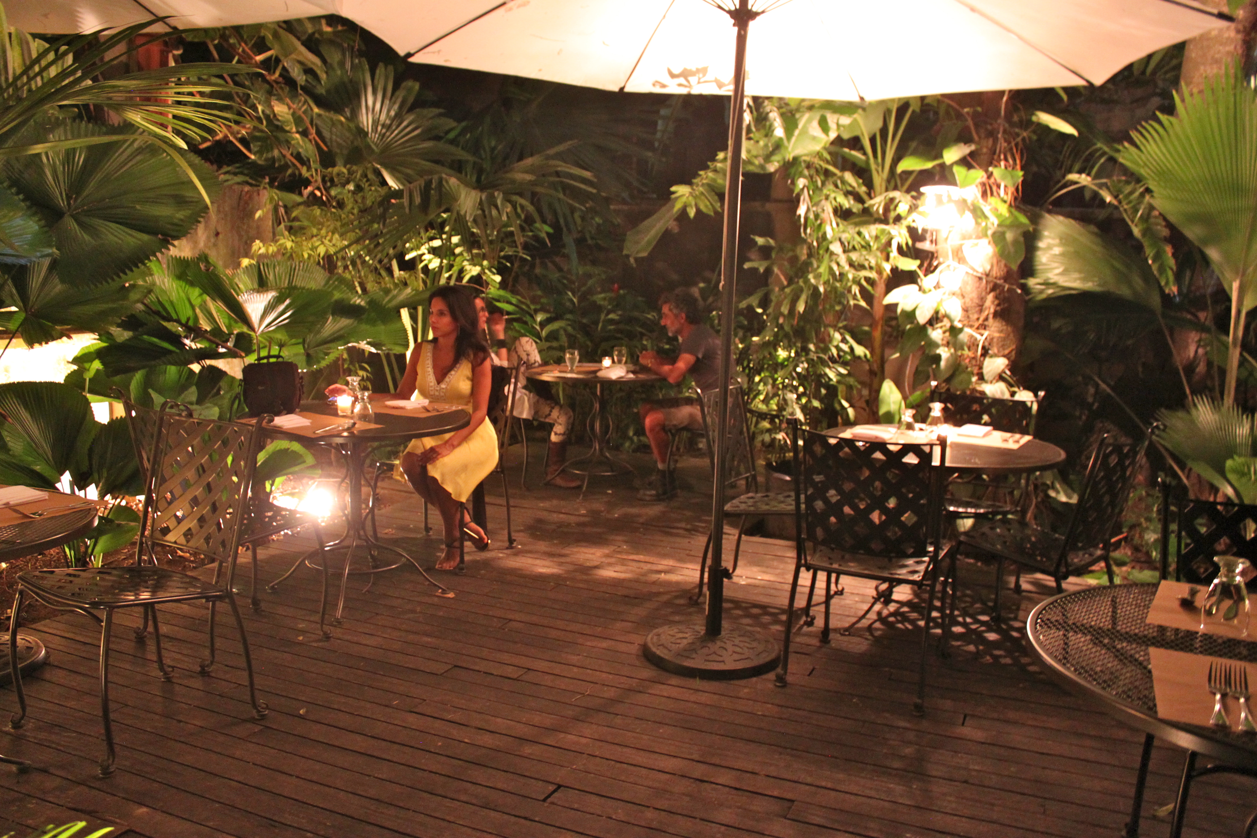 The Palm Garden in the back is situated against an original fortress wall and the other side is the Secret Garden and private dining space.