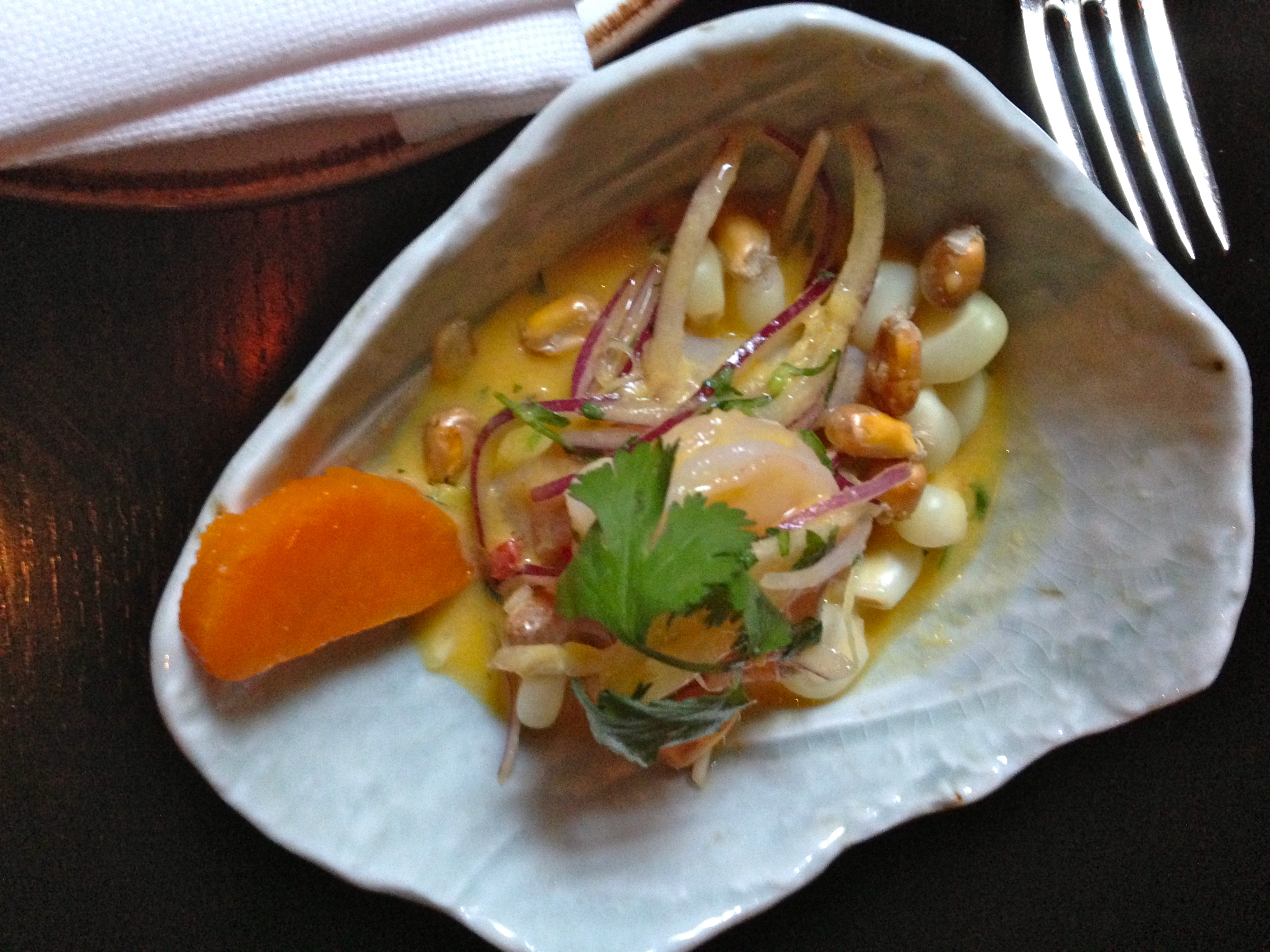 The aptly named corazón anticucho, traditional skewer, is beef heart, potatoes, choclo (Peruvian corn) and huacatay (Andean herb). The beef is rich and the spicy sauce is lovely with the potatoes and huge corn that pops in your mouth.