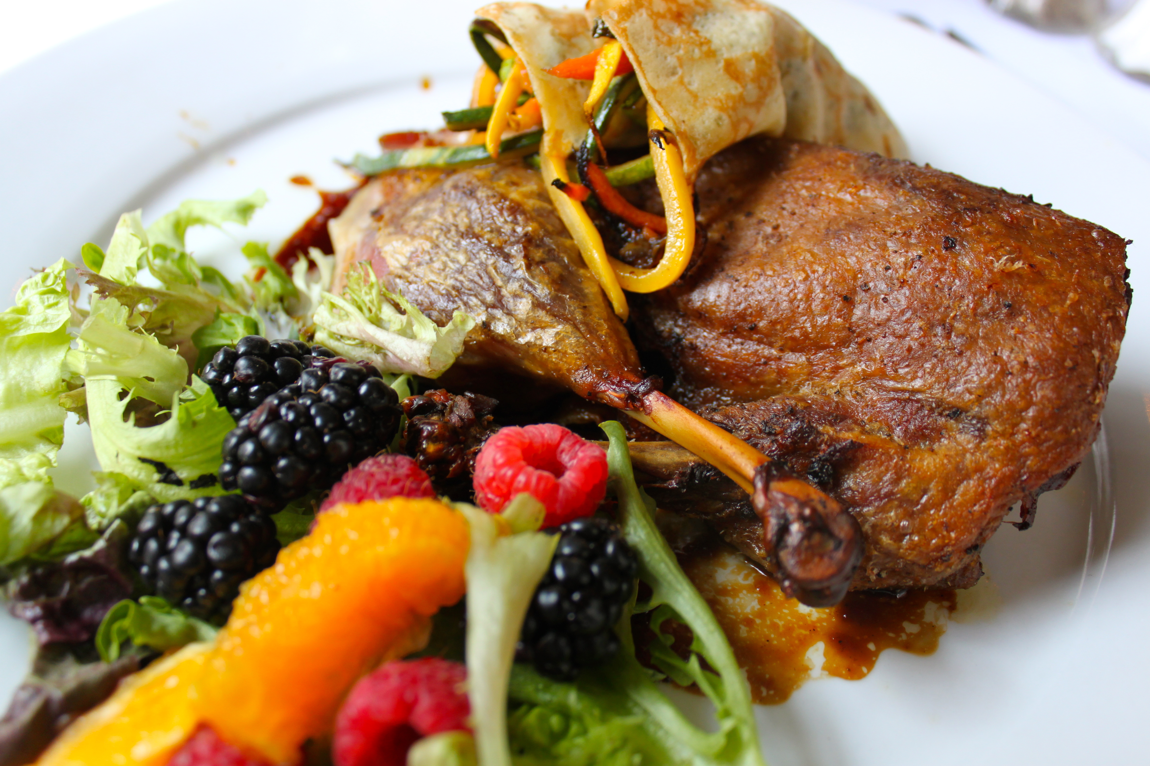 The idea of the crispy half duck was very interesting. It was served with a black vinegar BBQ glaze with seasonal fruit and vegetable crepes. The blackberries and raspberries were amazingly fresh and the crepes were a light complement to the rich duck. I did like the duck flavor but unfortunately it was a bit dry.