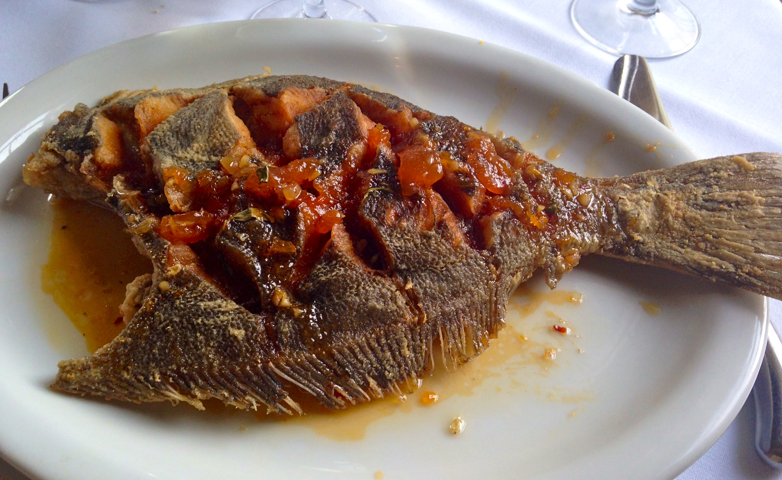 One of the house specials is the crispy scored Flounder. This Flounder is from Georgia and it is huge! Flash fried and served with apricot shallot chutney. Another sweet and salty triumph.