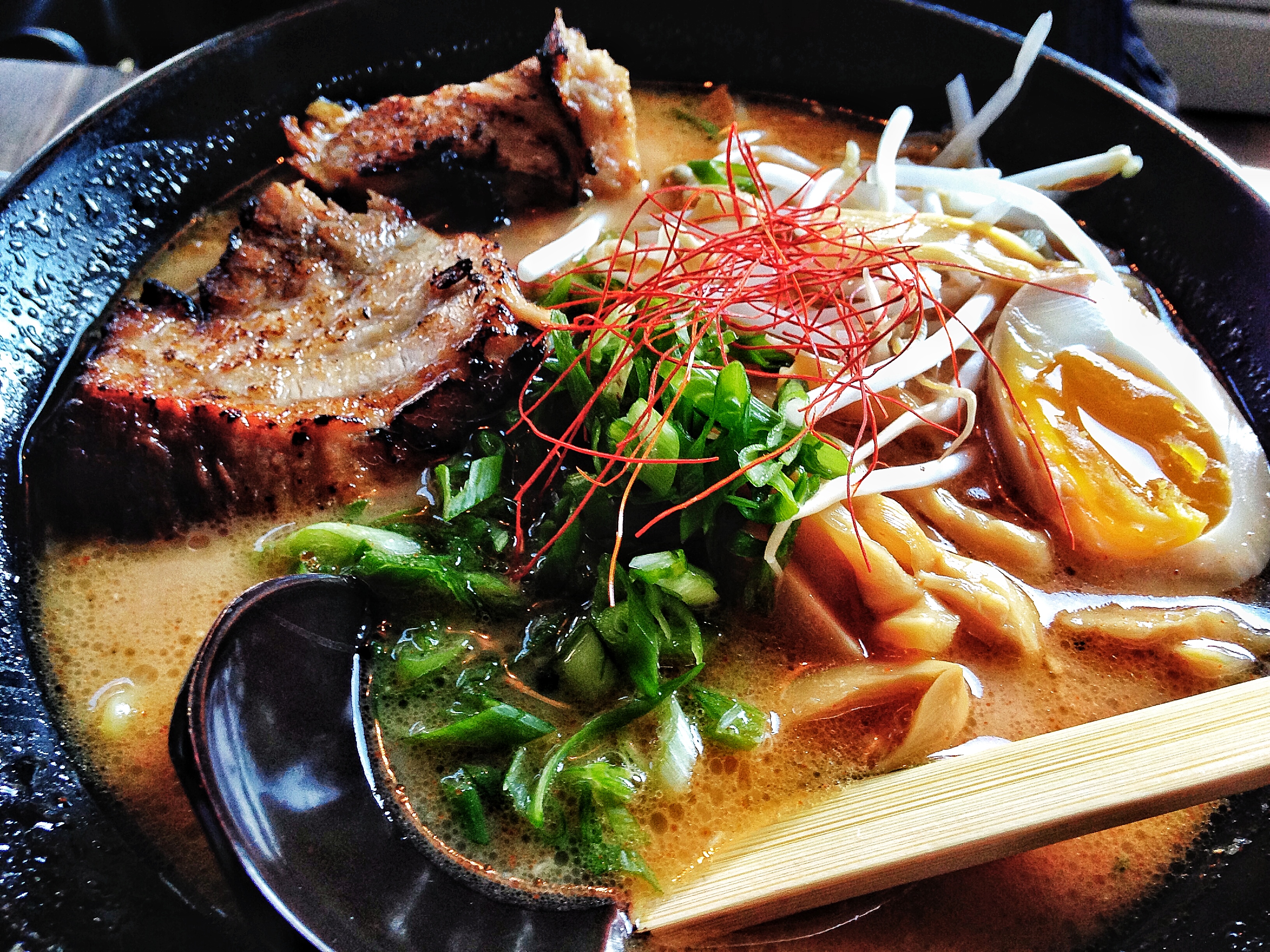 In addition to ramen the menu offers a variety of sushi and small plates such as seaweed salad, pork buns, grilled skewers and tempura. The Tonkotsu ramen has a 40+ cooking process made with kurobuta pork from small farms in Iowa. I really wish they served a ramen flight because I wanted to try each kind. We decided on: